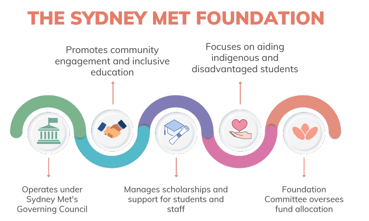 The Sydney Met Foundation, operating under the Governing Council, is dedicated to promoting the College’s commitment to community engagement and inclusive education by managing scholarship and support schemes for staff and students. Overseen by the Sydney Met Foundation Committee, the Foundation handles funds for educational purposes, particularly aiding domestic and international indigenous and disadvantaged students and staff.