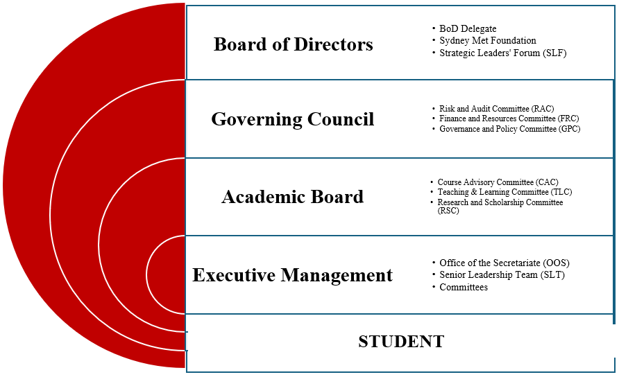 The Sydney Met governance model has four tiers. The top of the tier is the college’s Board of Directors, comprising shareholders’ representatives, who set the overall strategic direction and ensure the college’s long-term financial sustainability. The BOD appoints the Governing Council (GC) through an Instrument of Appointment giving it responsibility for the governance of Sydney Met. The GC is the peak governing body of the College, reporting to the BoD through its Chair. It sets the directions for, monitors and is accountable for all operations of Sydney Met. The GC may form committees as and when required. The Academic Board (AB) is the academic governing body within the College, reporting to the GC through its Chair. It is responsible to oversee and monitor the academic activities of the College and advising the GC on academic matters. The Executive Management (EM) is led by the Chief Executive Officer (CEO) and President, who is the senior officer responsible for College operations. The CEO is responsible for implementing the College’s vision and overseeing the day-to-day operations of the college. The academic leadership team, consisting of the Executive Dean and Department Heads, provides input on academic programs and policies, while faculty and staff offer a platform for staff and student voices to be heard. This collaborative approach enables effective decision-making, promotes transparency, and fosters a sense of community among Sydney Met stakeholders.